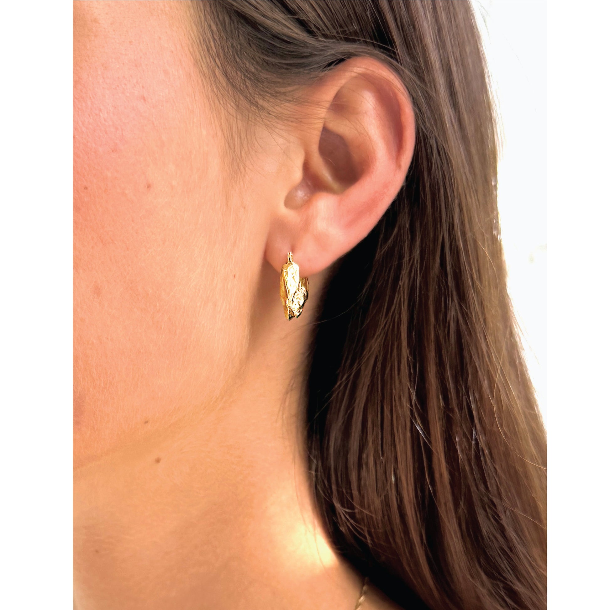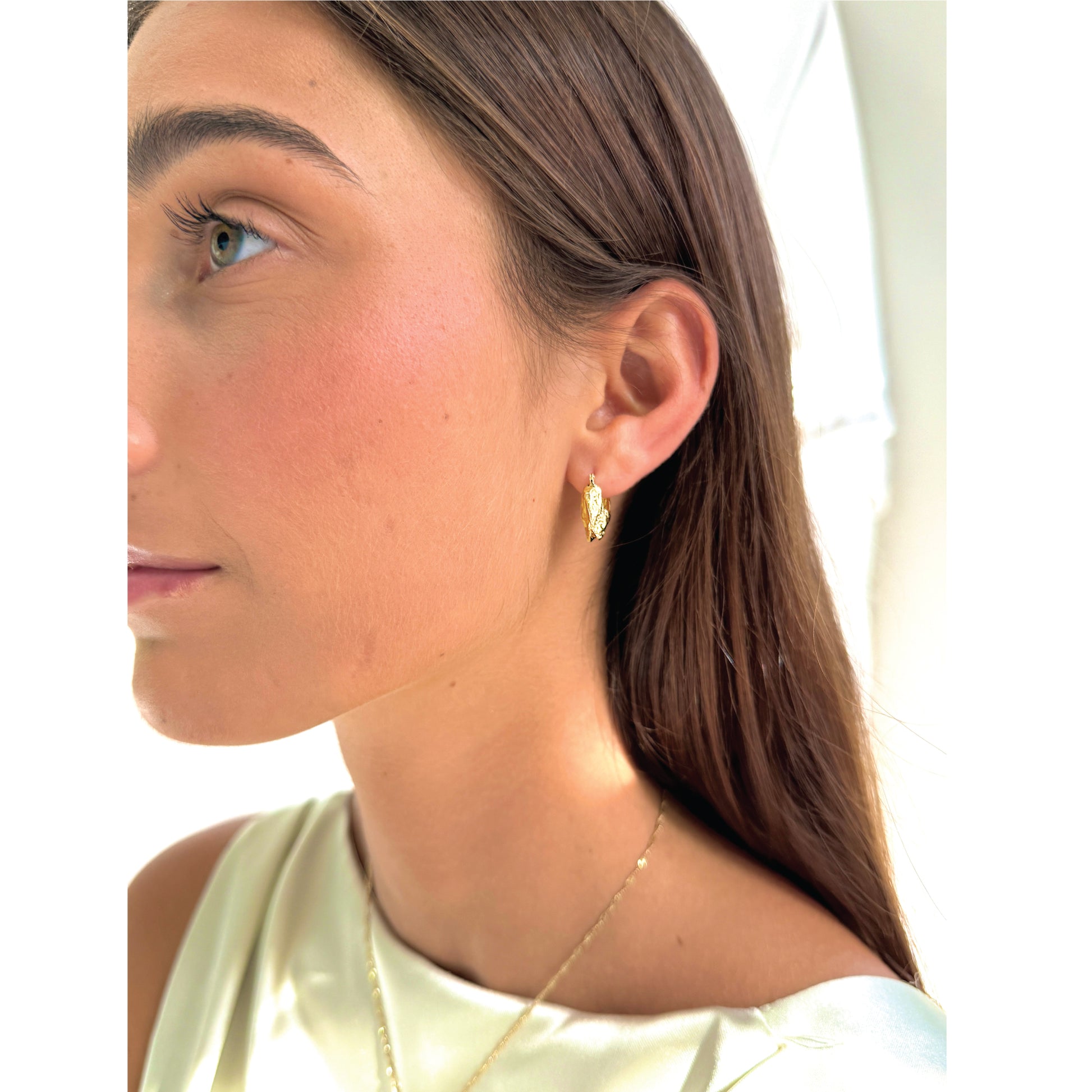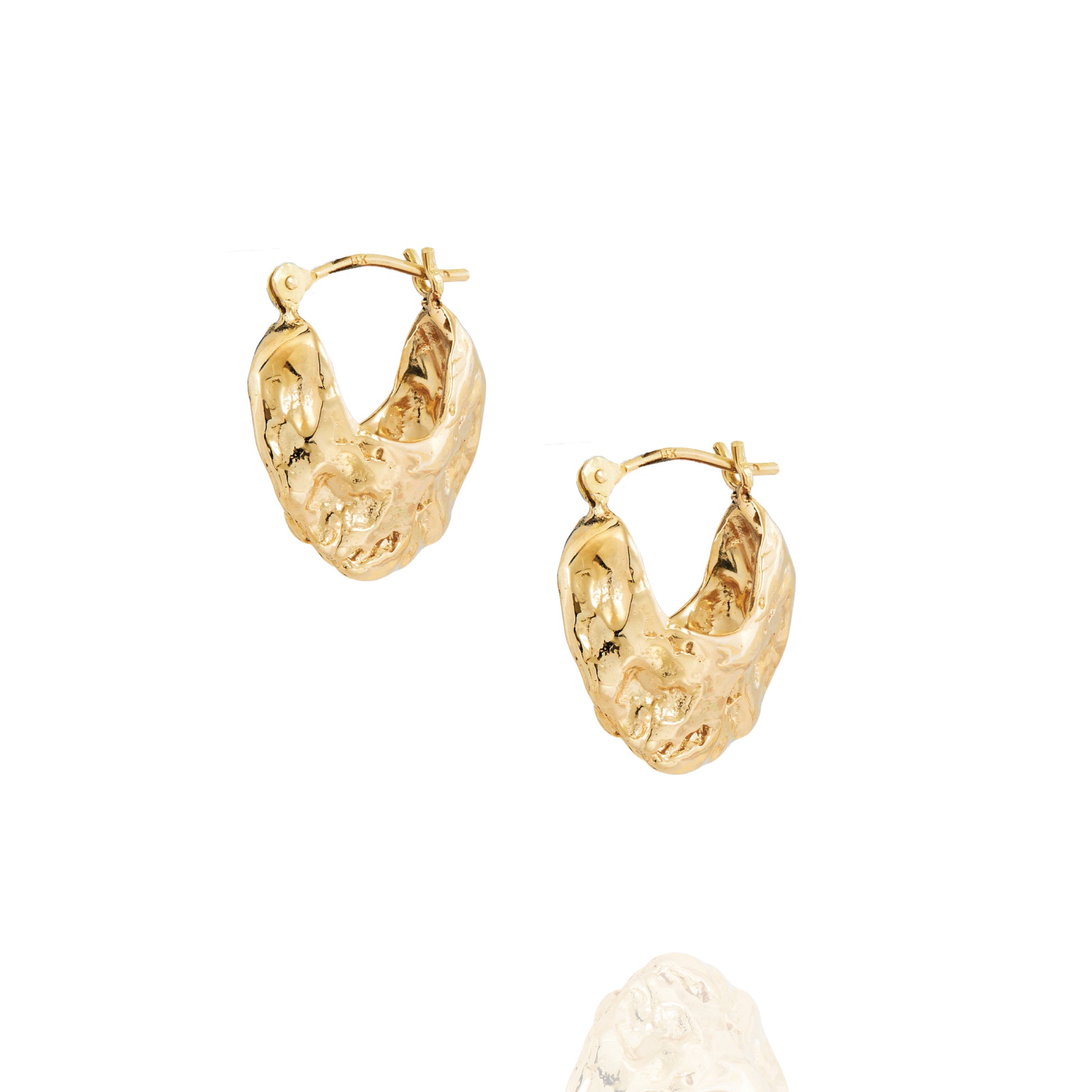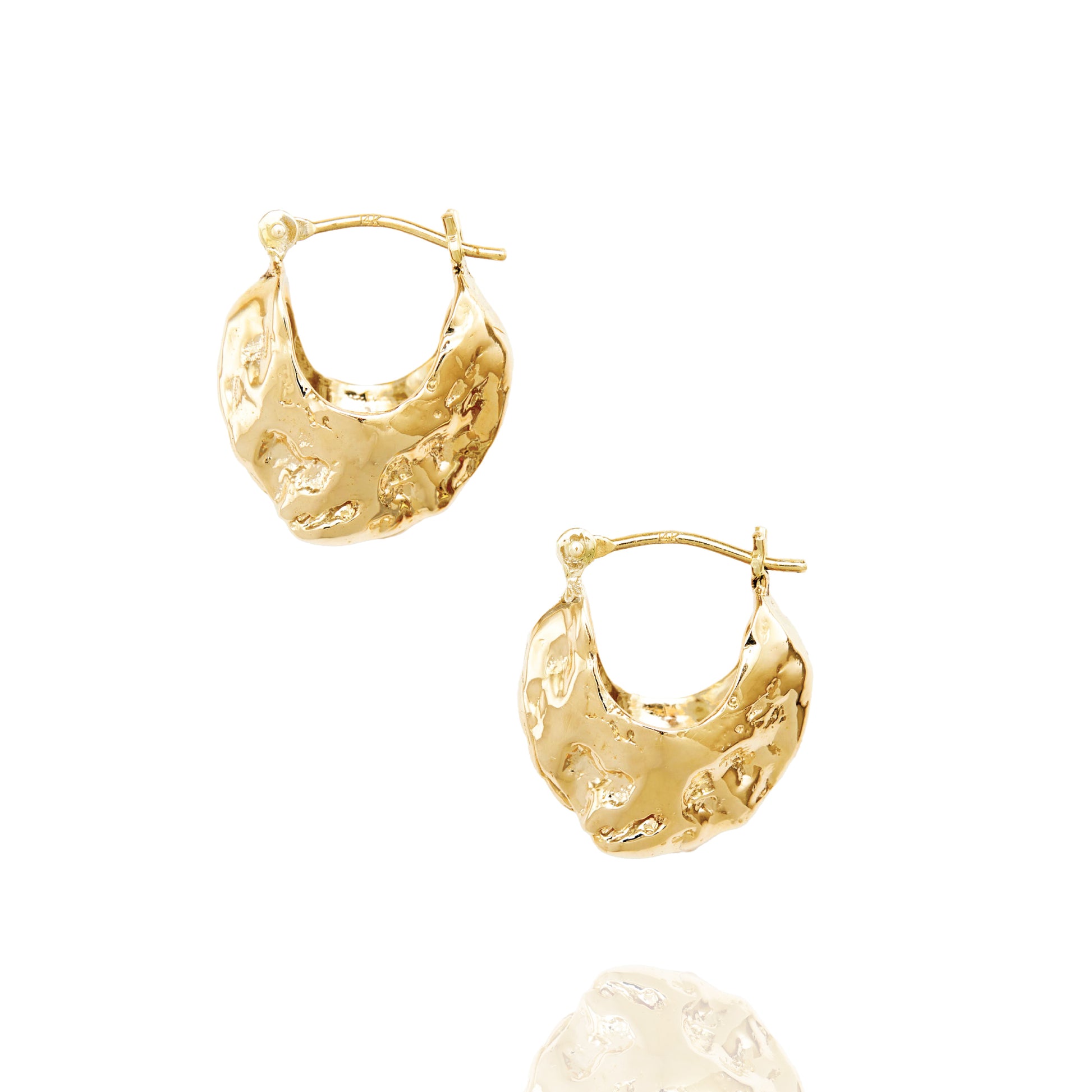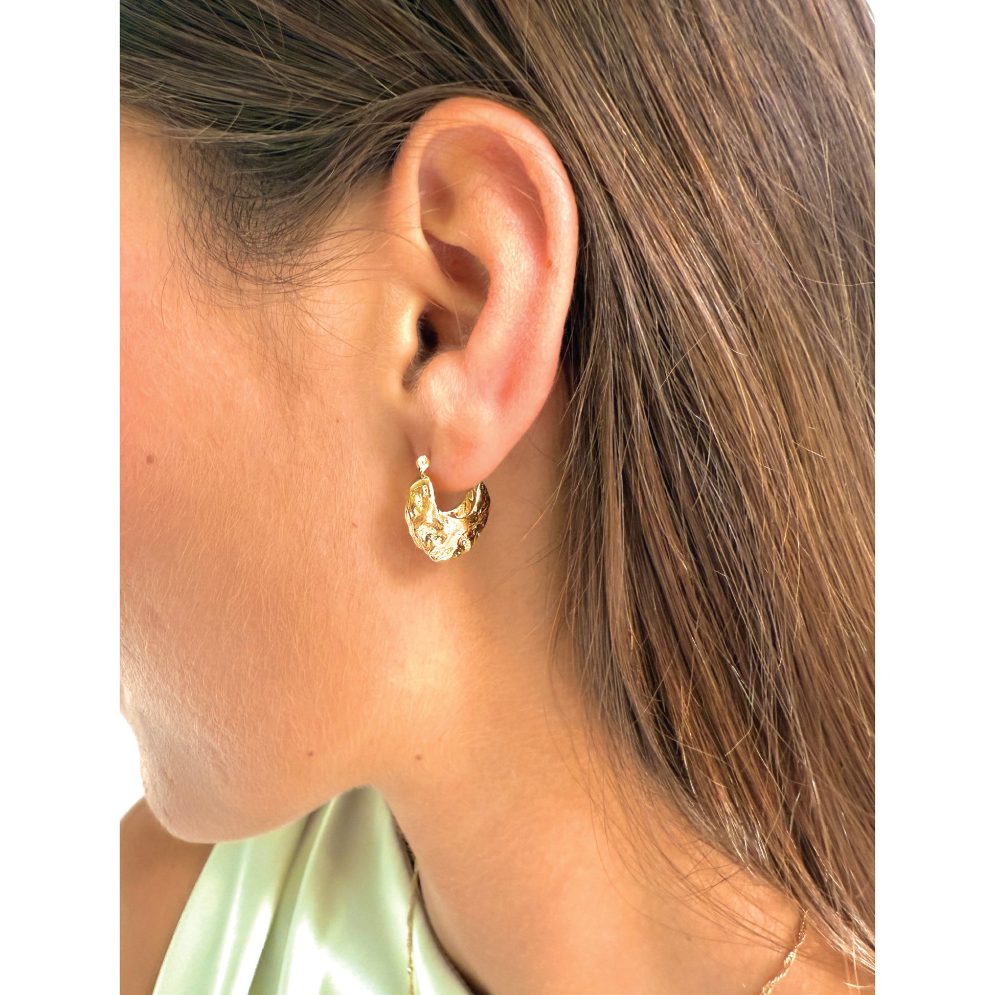 Ana Maria Huggie Hoop Earrings are made of solid 14k gold. For this original design we were inspired by surrealism, exploring the concept of negative space. Influenced by different shell shapes found, we created this luxurious huggie hoop earring in solid gold.