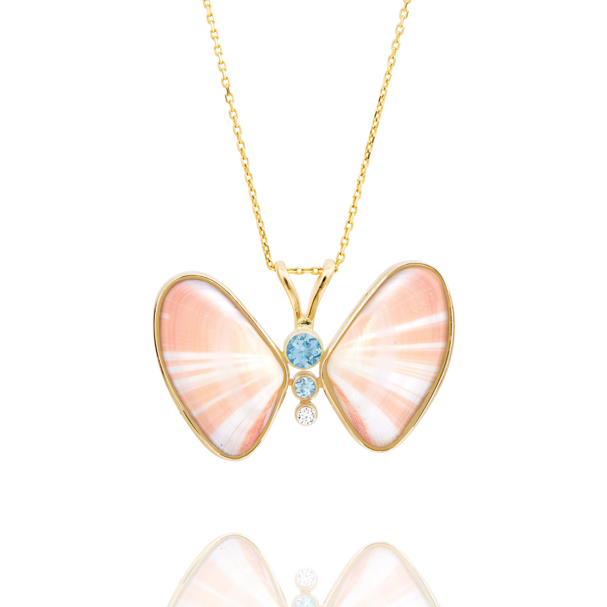 Dalia Butterfly Necklace is a luxurious fine jewelry piece made of shell with natural diamond and blue topaz gemstones, set in a handmade 14k gold setting. Inspired by surrealism, this whimsical piece reimagines shells found in the ocean and transforms them into a creature of the air.