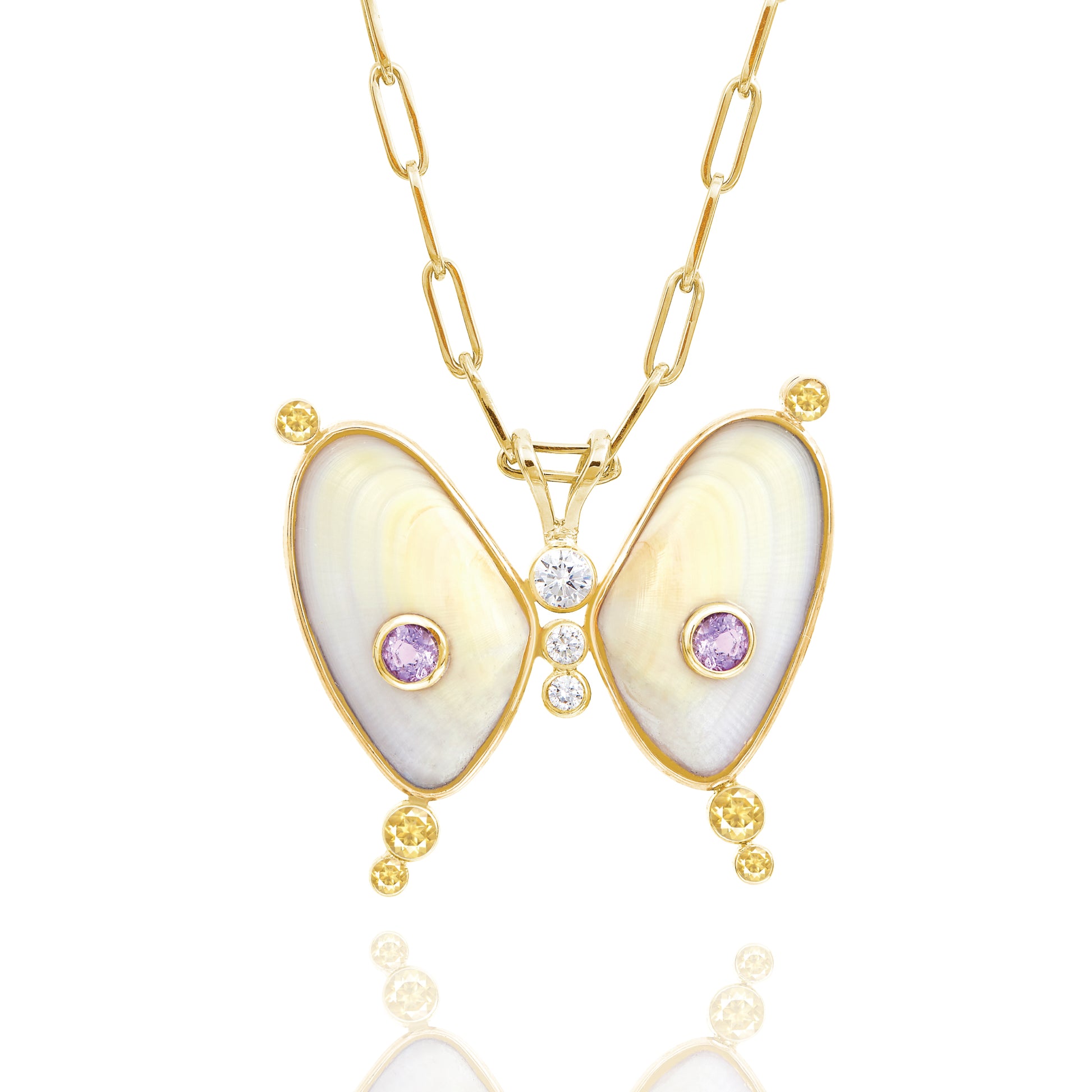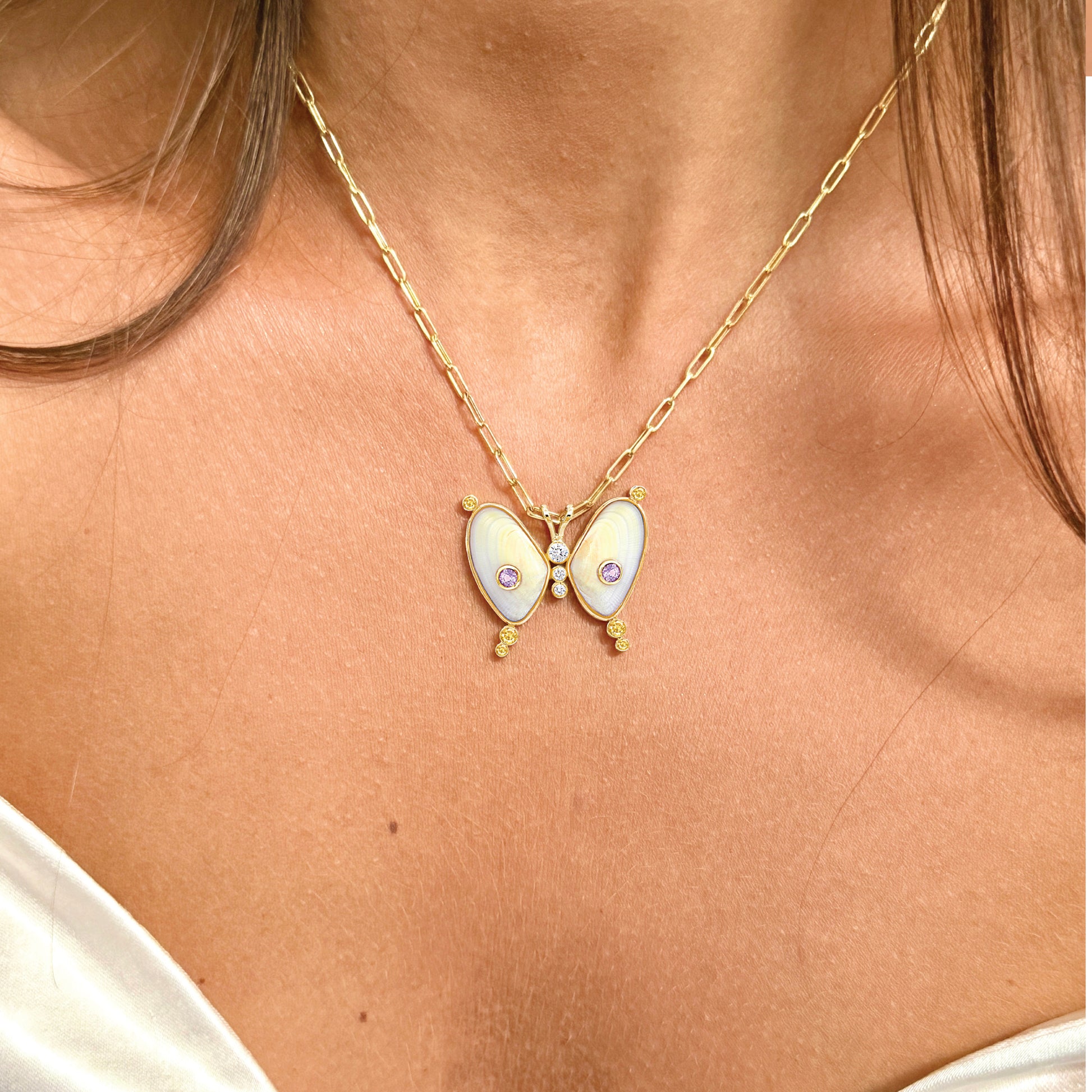 De Milo Butterfly Necklace is a luxurious fine jewelry piece made of shell with natural diamonds, amethyst, and citrine gemstones. Truly one of a kind, this piece is set in a custom 14k gold setting. Inspired by surrealism, this whimsical piece reimagines shells found in the ocean and transforms them into a creature of the air.