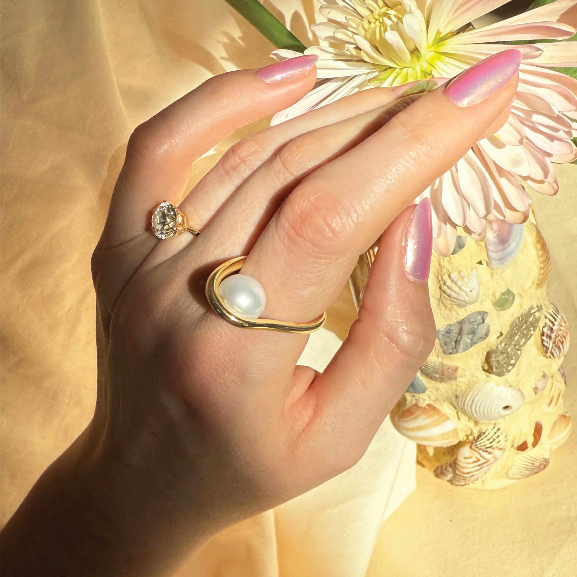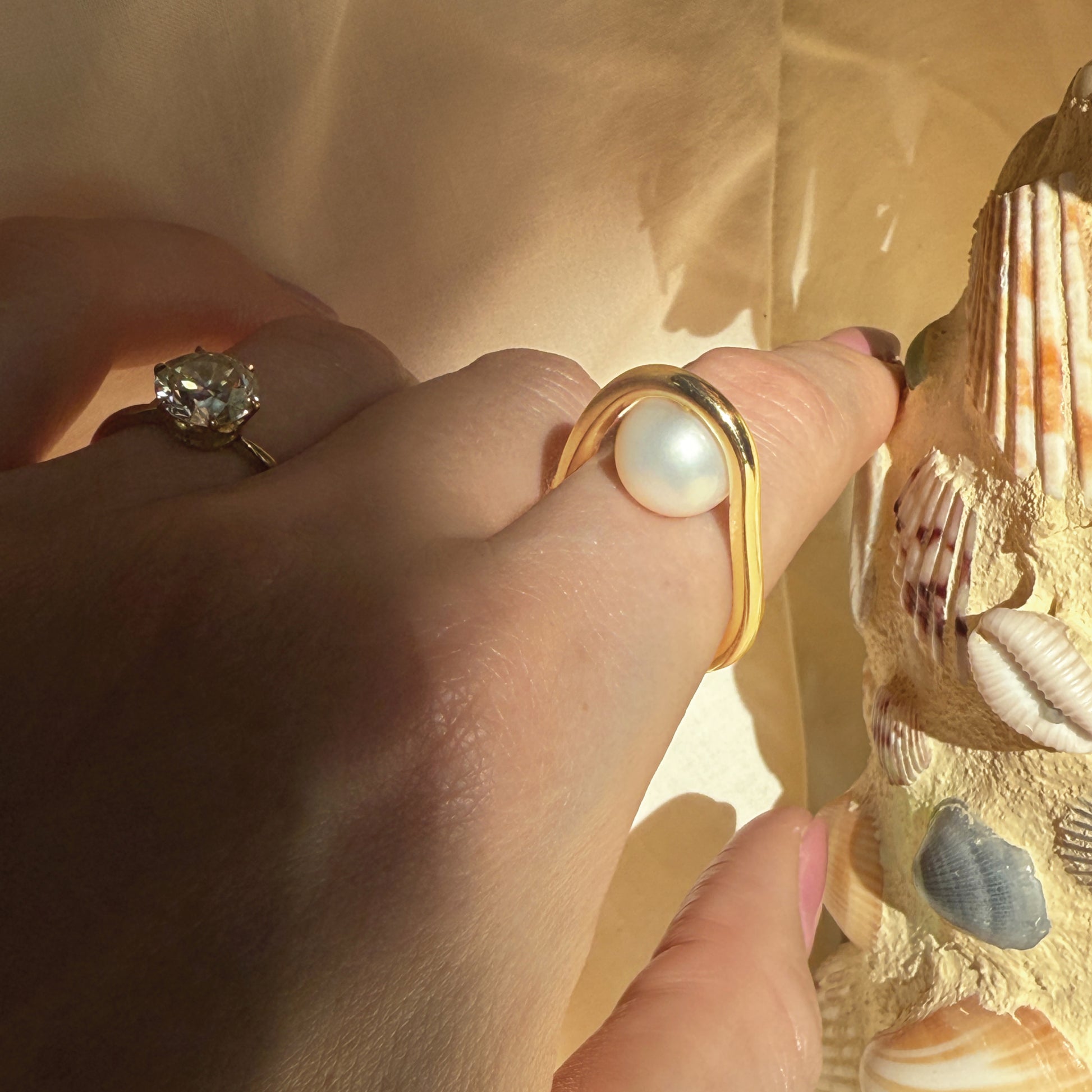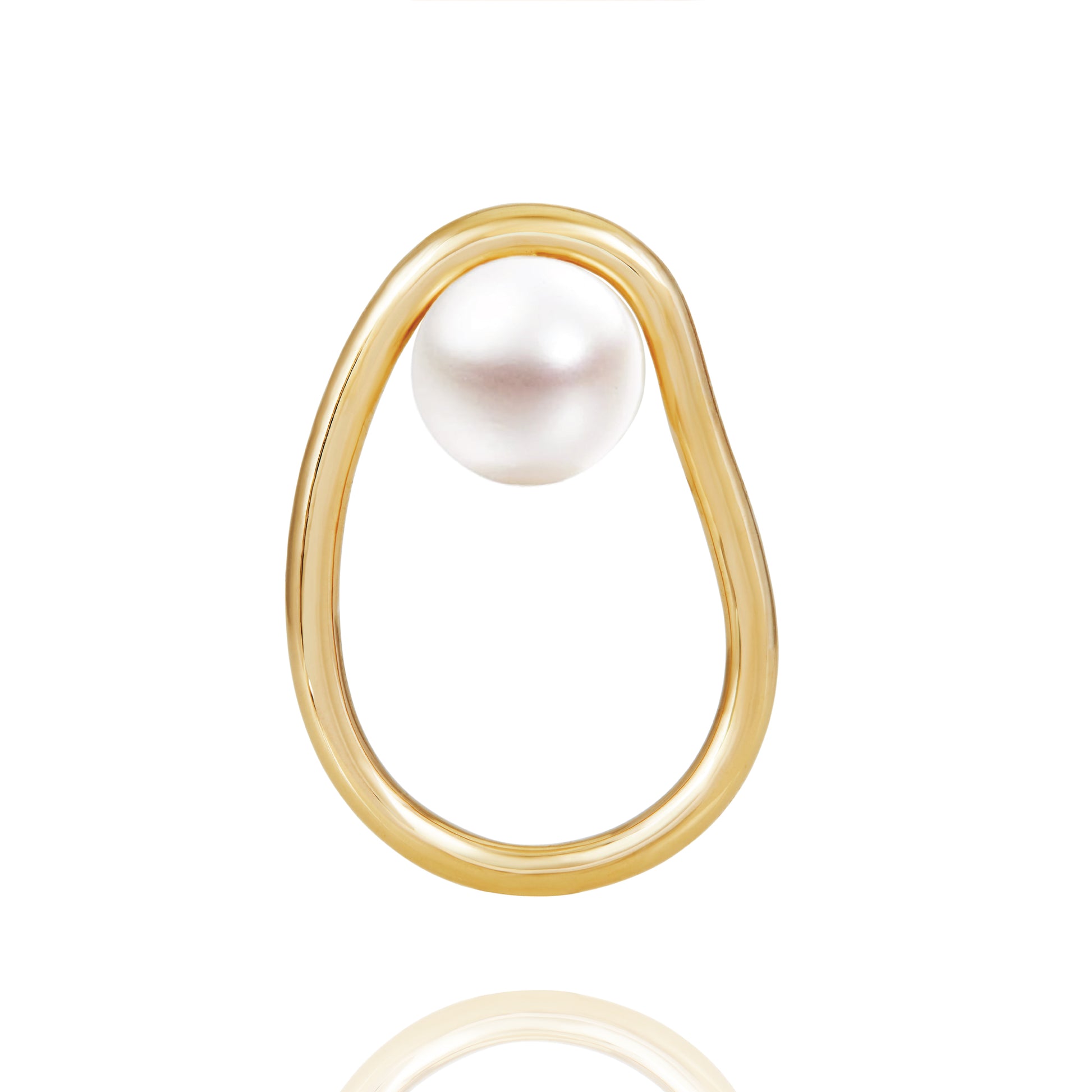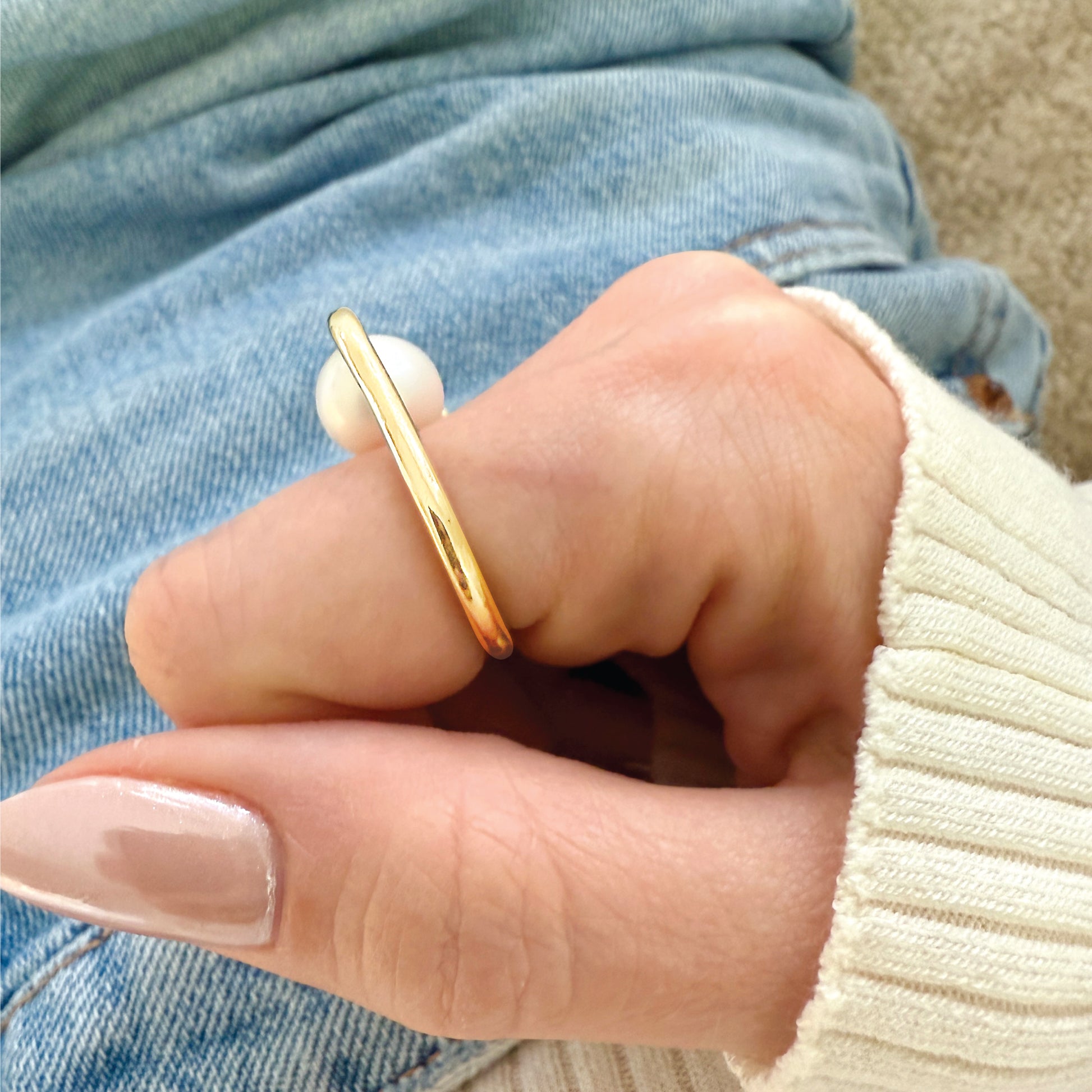 Floating Pearl 14k gold ring is a luxurious fine jewelry piece made of solid 14k gold with 10mm freshwater pearl. Inspired by surrealism, this statement piece is designed to 'float' on the hand, creating a beautiful illusion. Ring is size 7. Email us at rennstudio.ny@gmail.com if you need a custom size.
