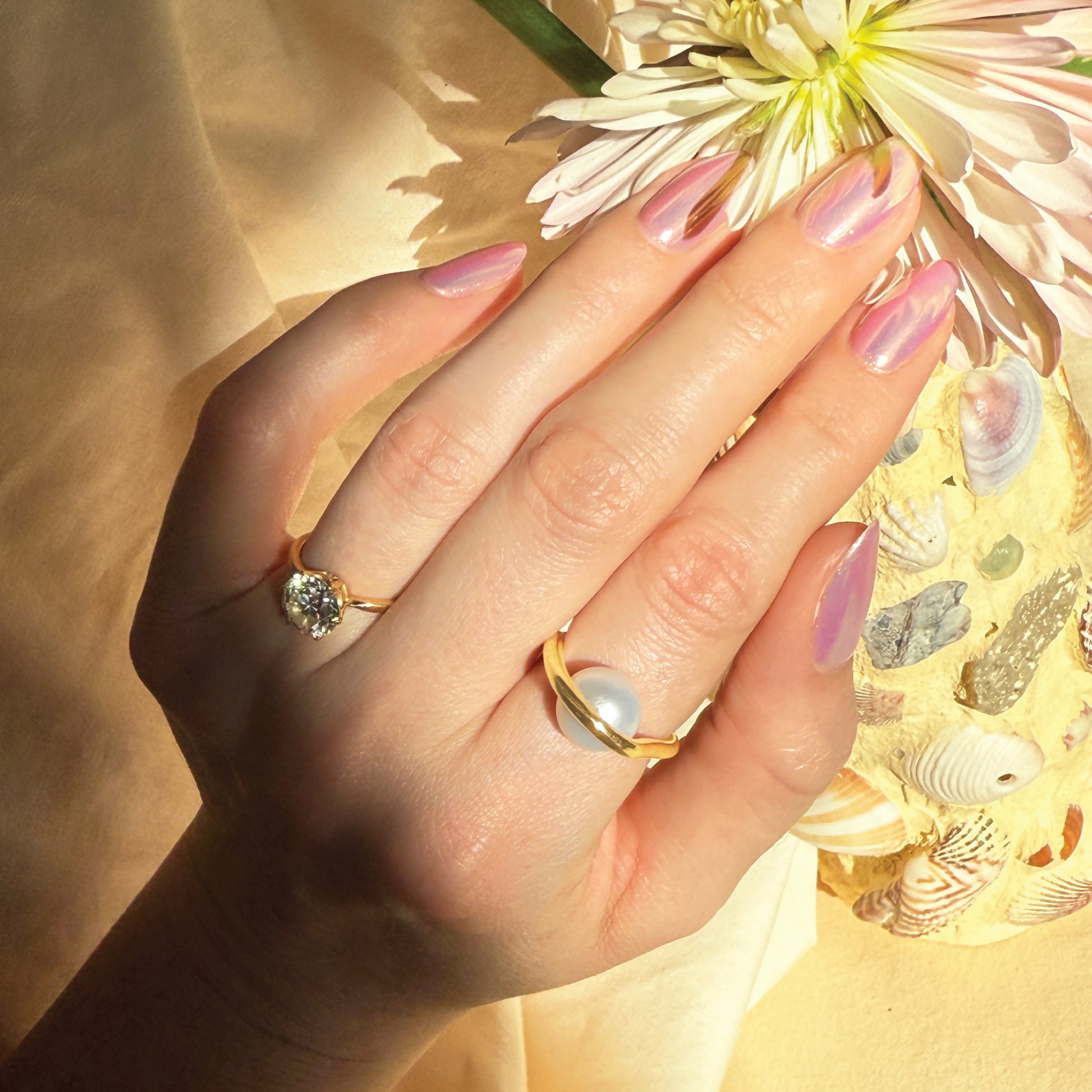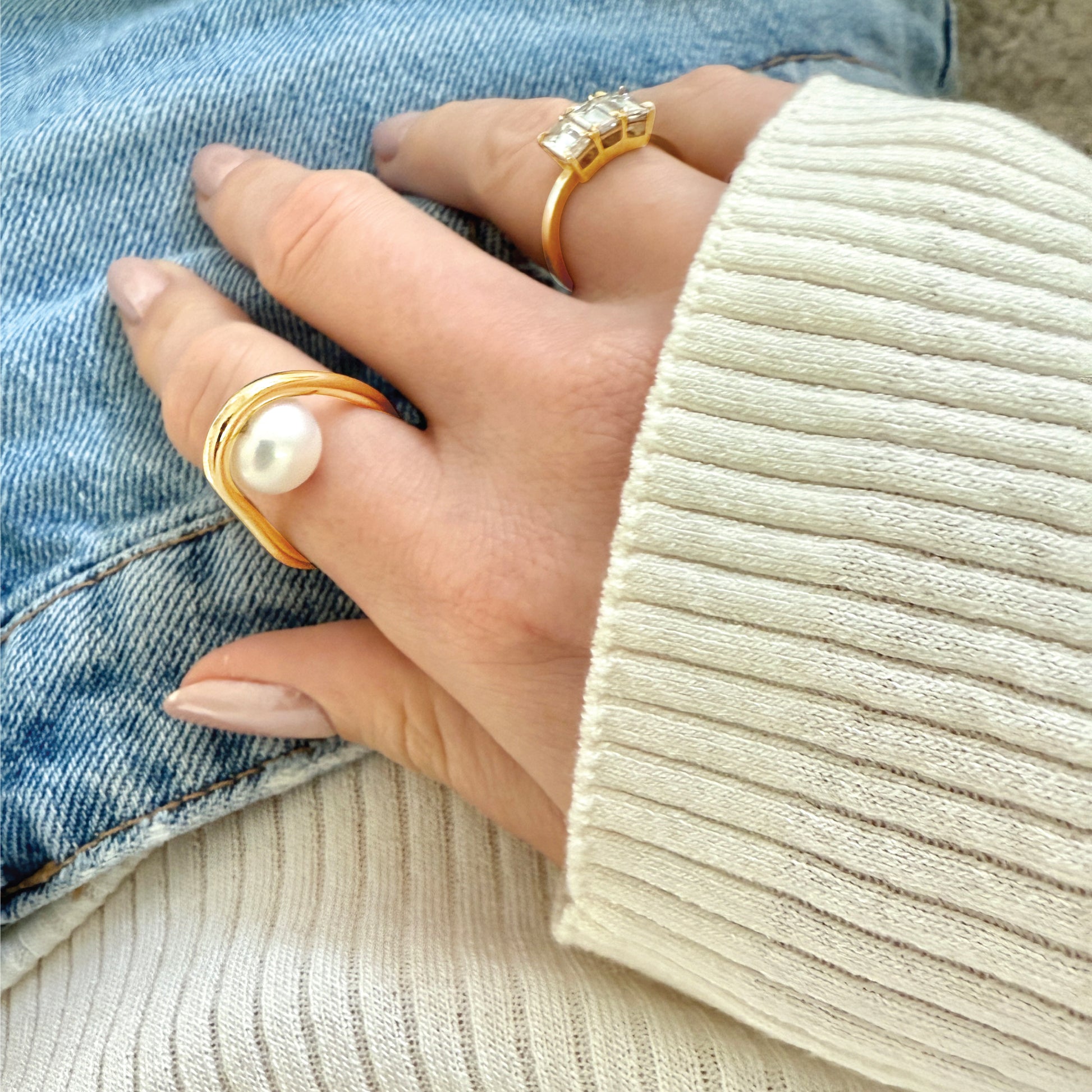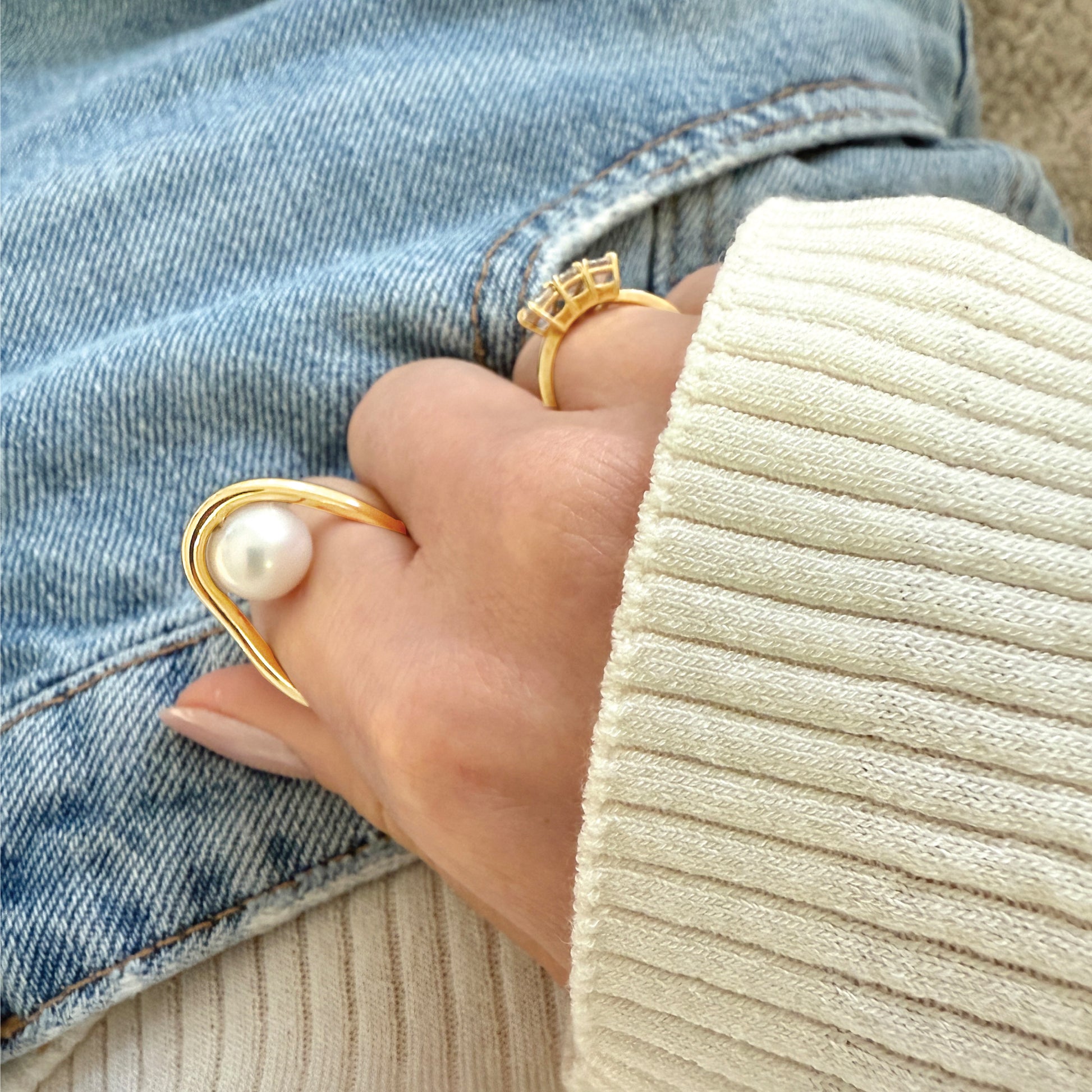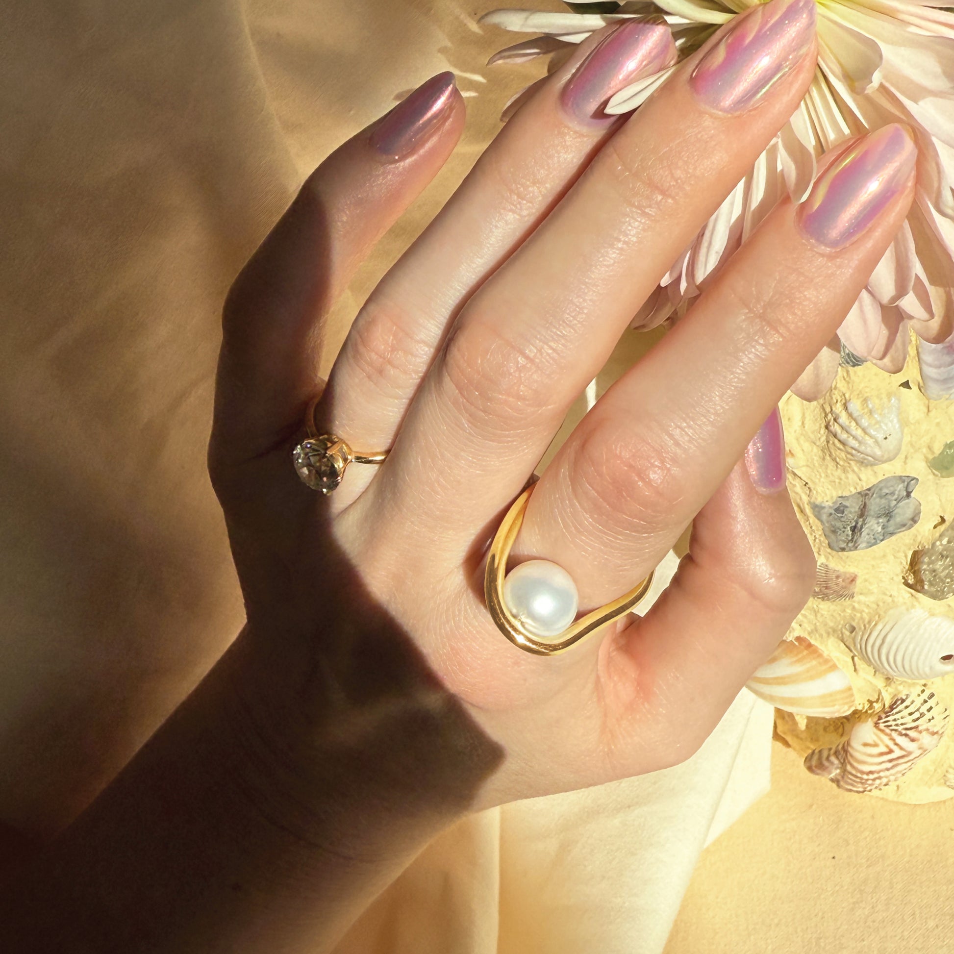 Floating Pearl 14k gold ring is a luxurious fine jewelry piece made of solid 14k gold with 10mm freshwater pearl. Inspired by surrealism, this statement piece is designed to 'float' on the hand, creating a beautiful illusion. Ring is size 7. Email us at rennstudio.ny@gmail.com if you need a custom size.