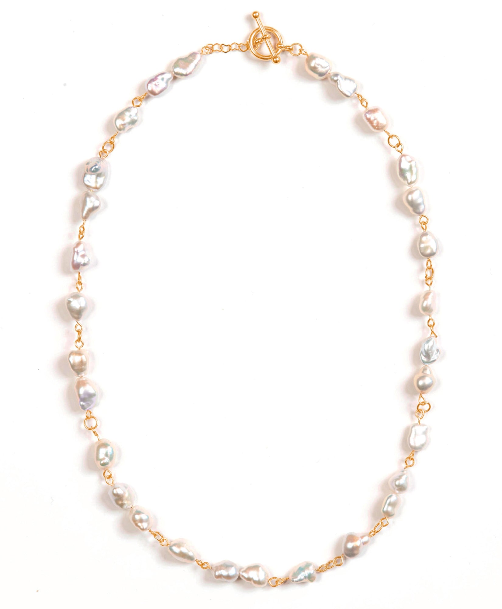 An artisanal handmade chain connects lustrous freshwater pearls in beautiful organic shapes.