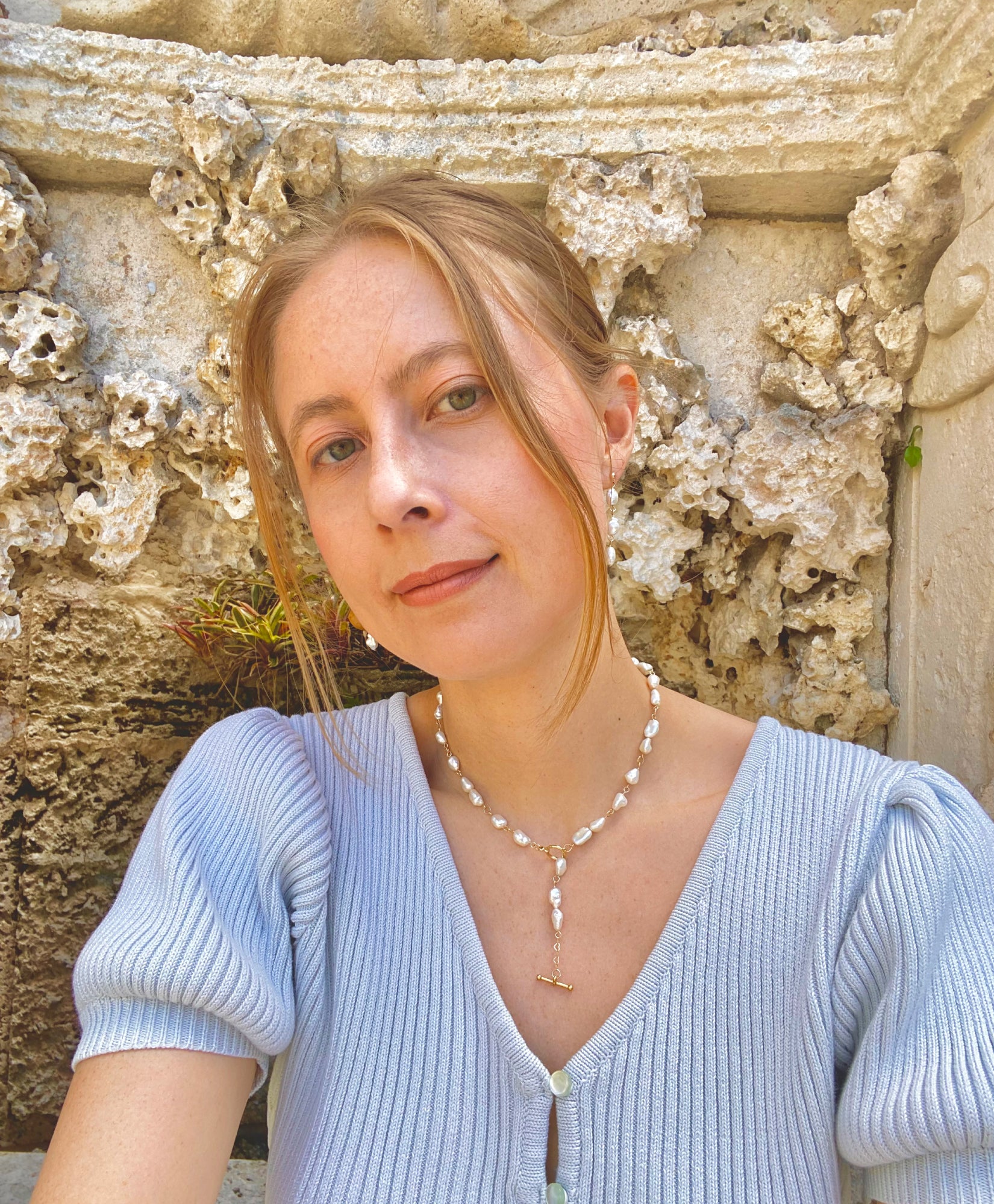 Islamorada Necklace is custom made for you by hand in New York. Necklace measures 18" long and is made of genuine freshwater pearls with 14k gold fill. Please allow 2-3 weeks shipping.