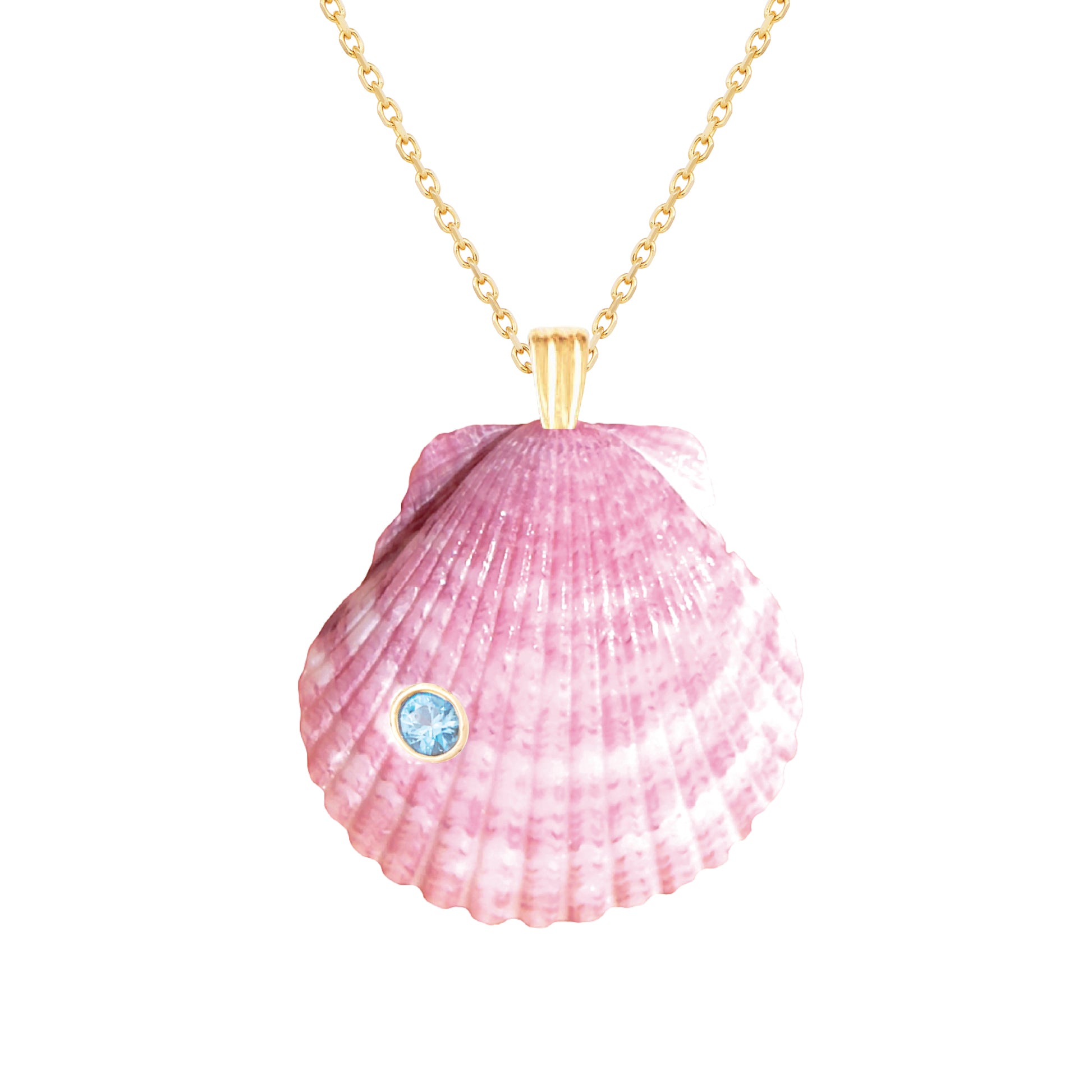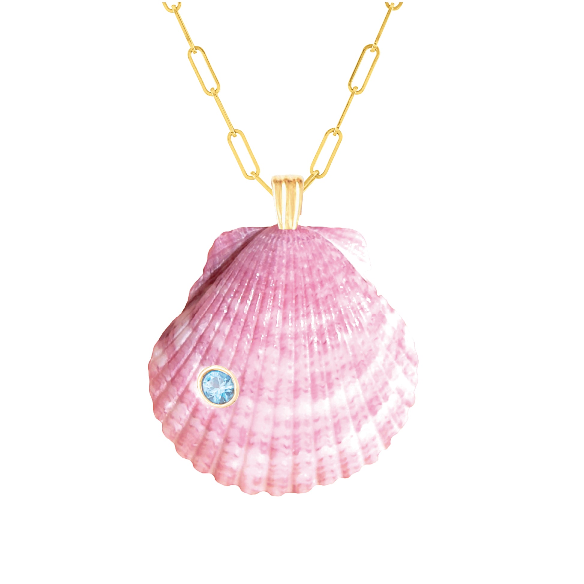 Natural shell pendant with solid 14k gold findings and natural blue topaz gemstone. Wear this pendant alone or style it with other gold chains for a beautiful layered effect.