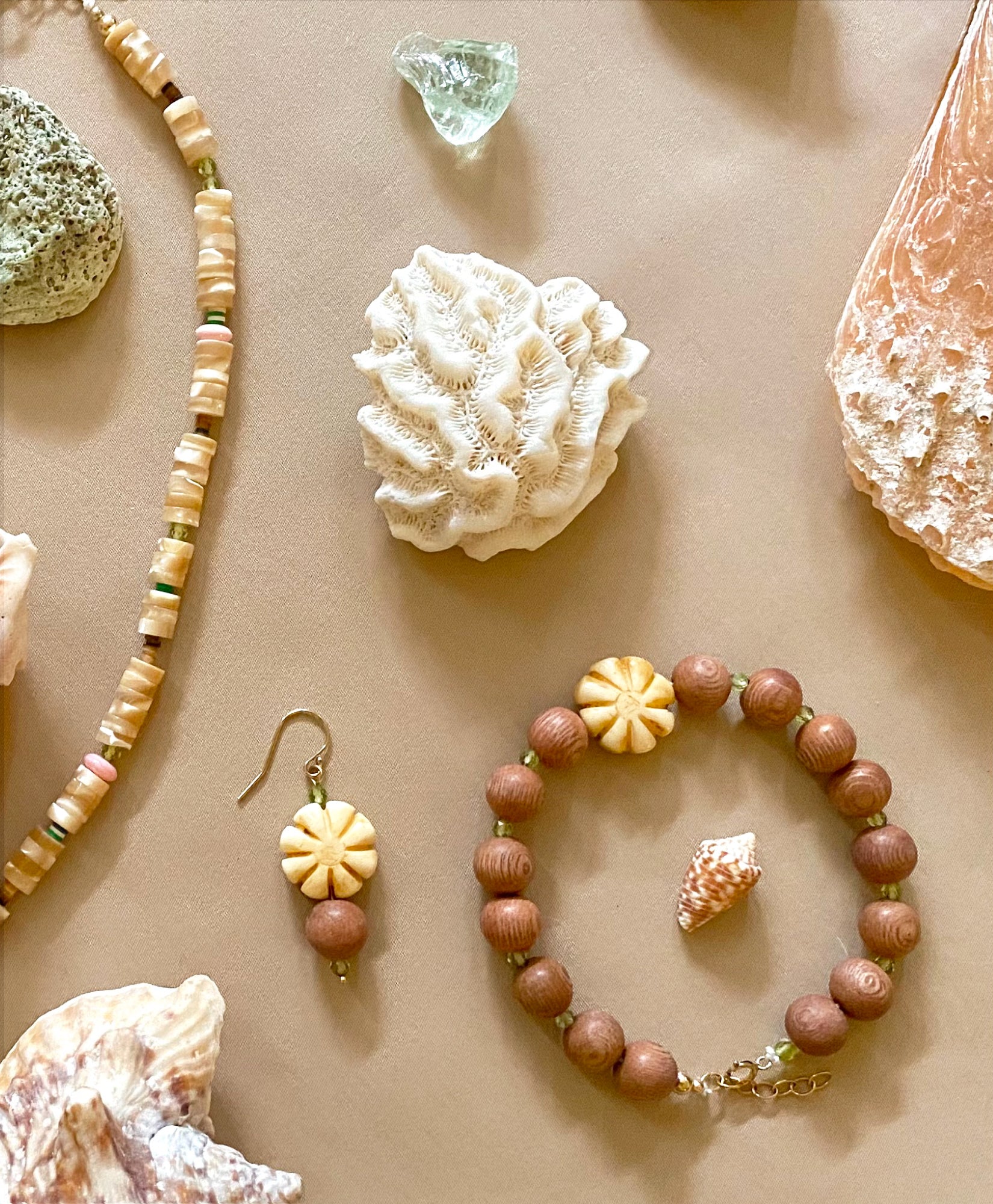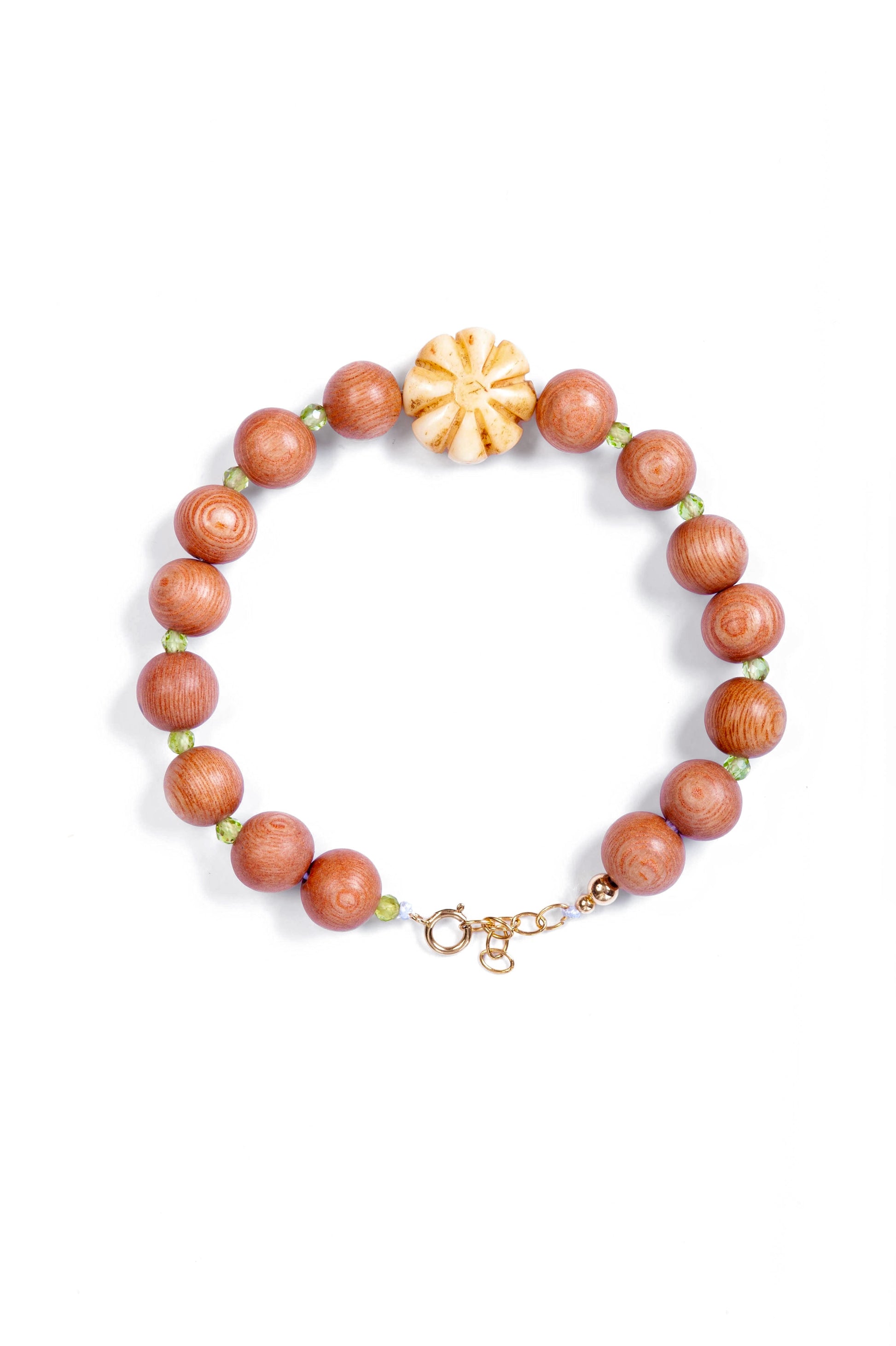 Nomad Bracelet features a vintage hand carved daisy with rosewood beads and peridot gemstones. Due to some of the materials being vintage, we have limited stock on this item, making it all the more special.