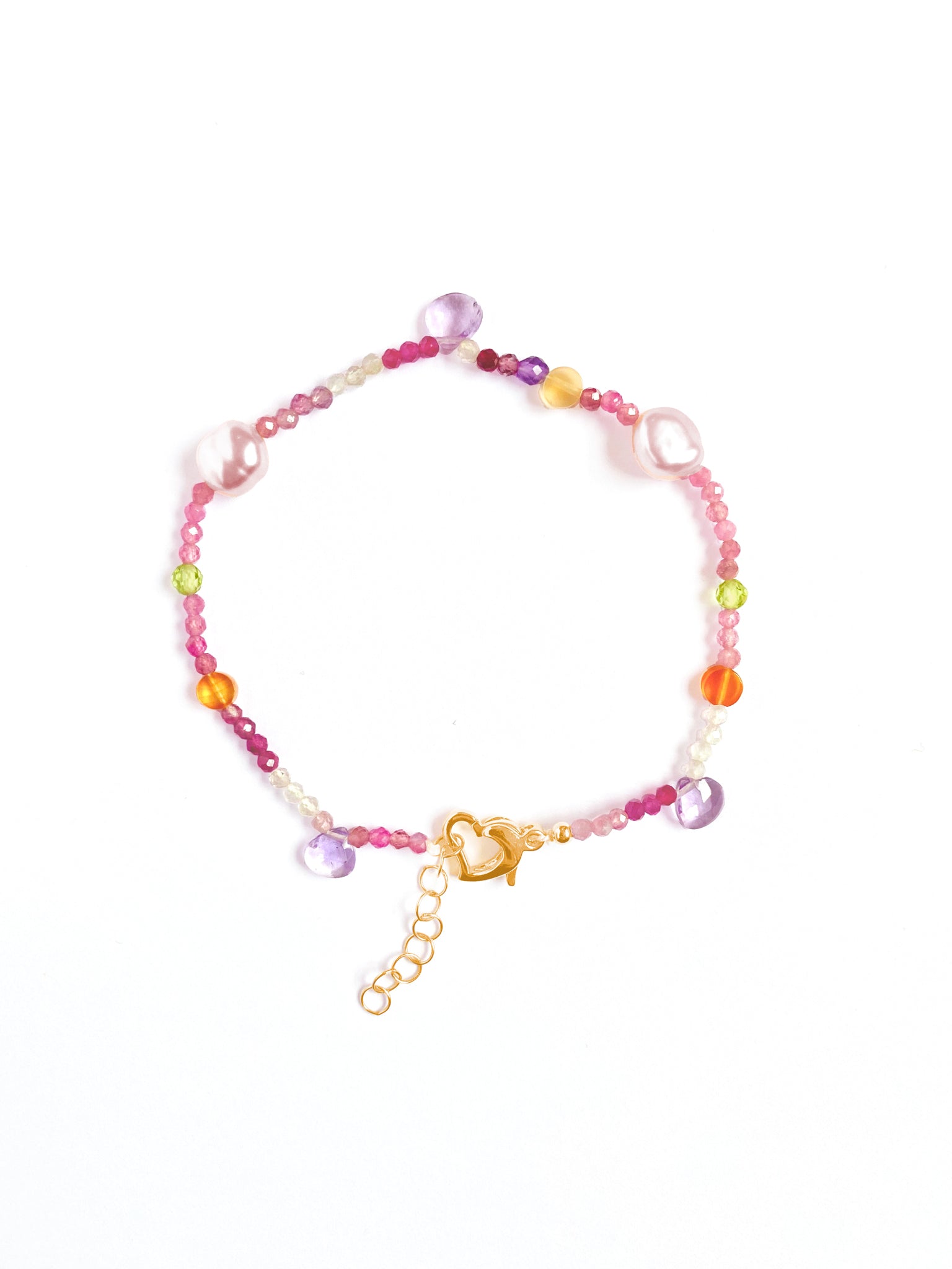 Just like the land, it is something to treasure. Rainbow Jewel Bracelet is made of pink tourmaline, amethyst, peridot, carnelian and freshwater pearls.