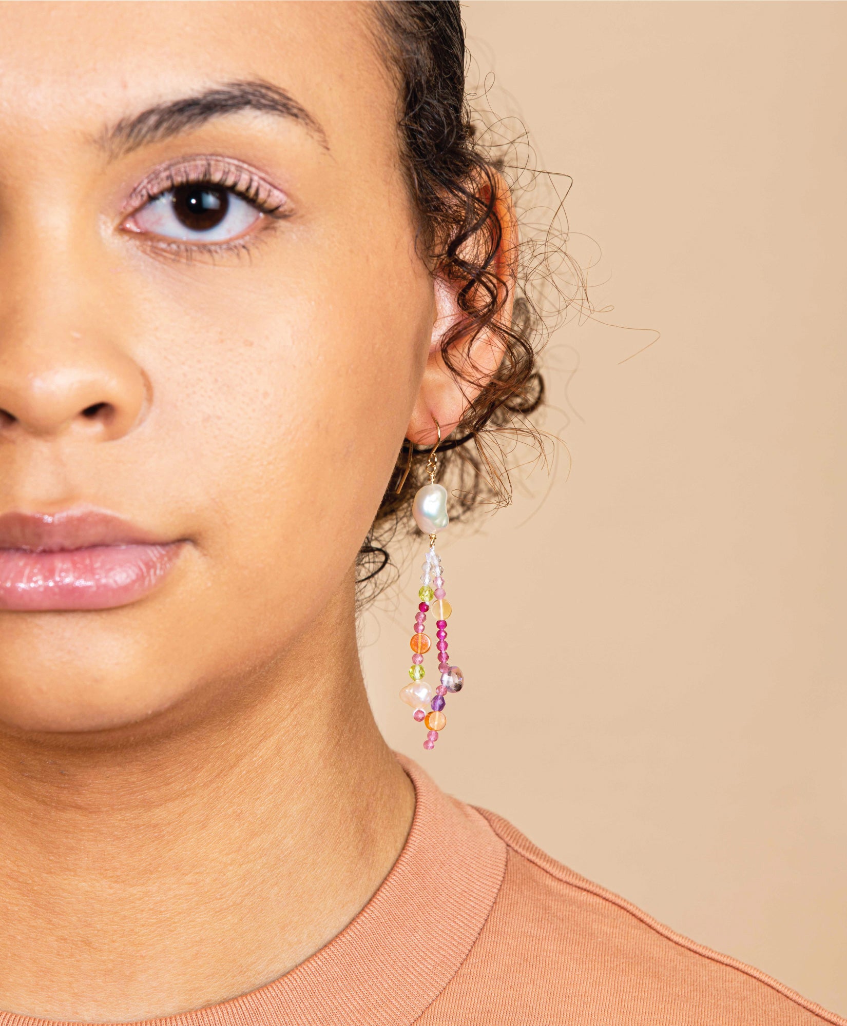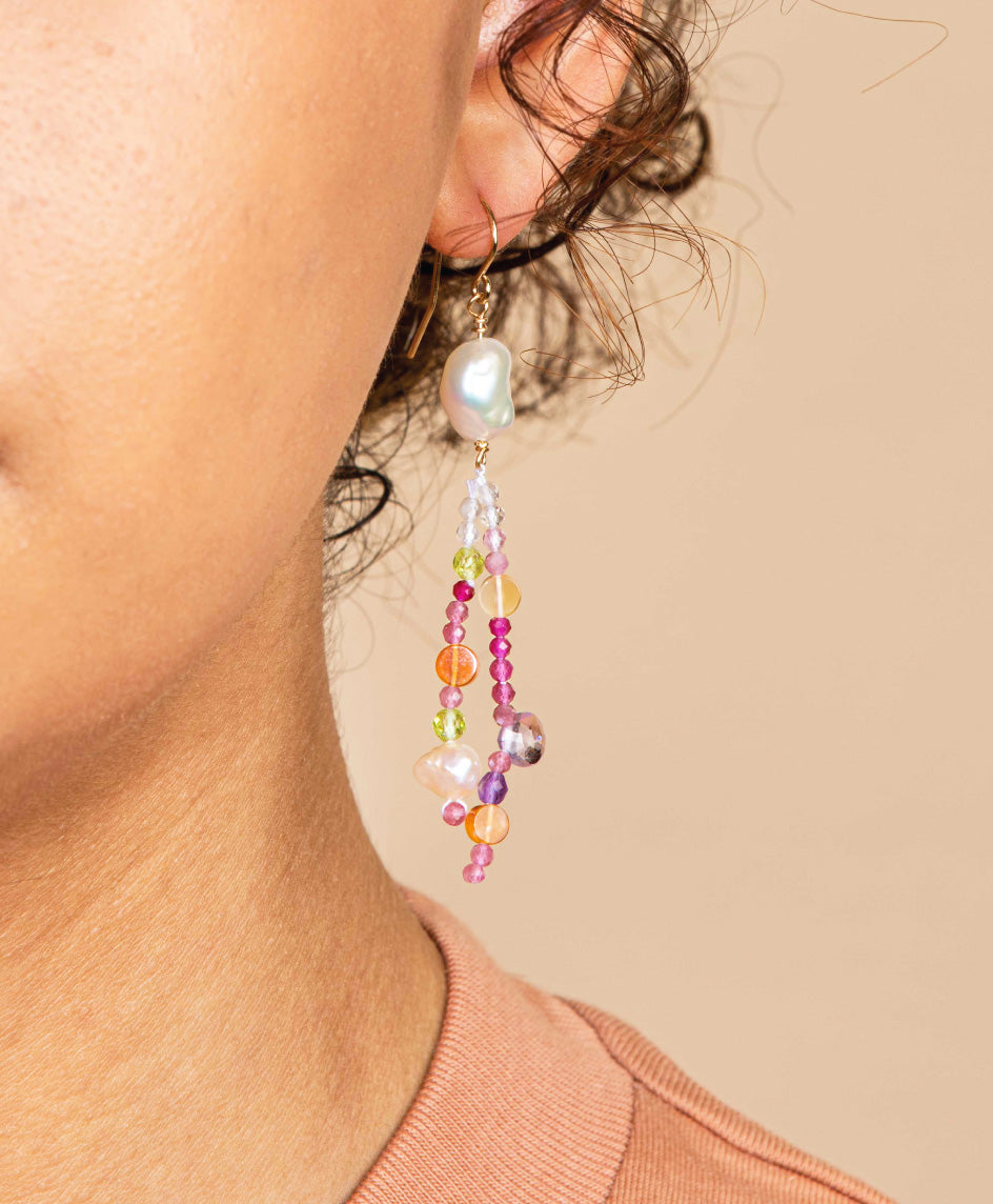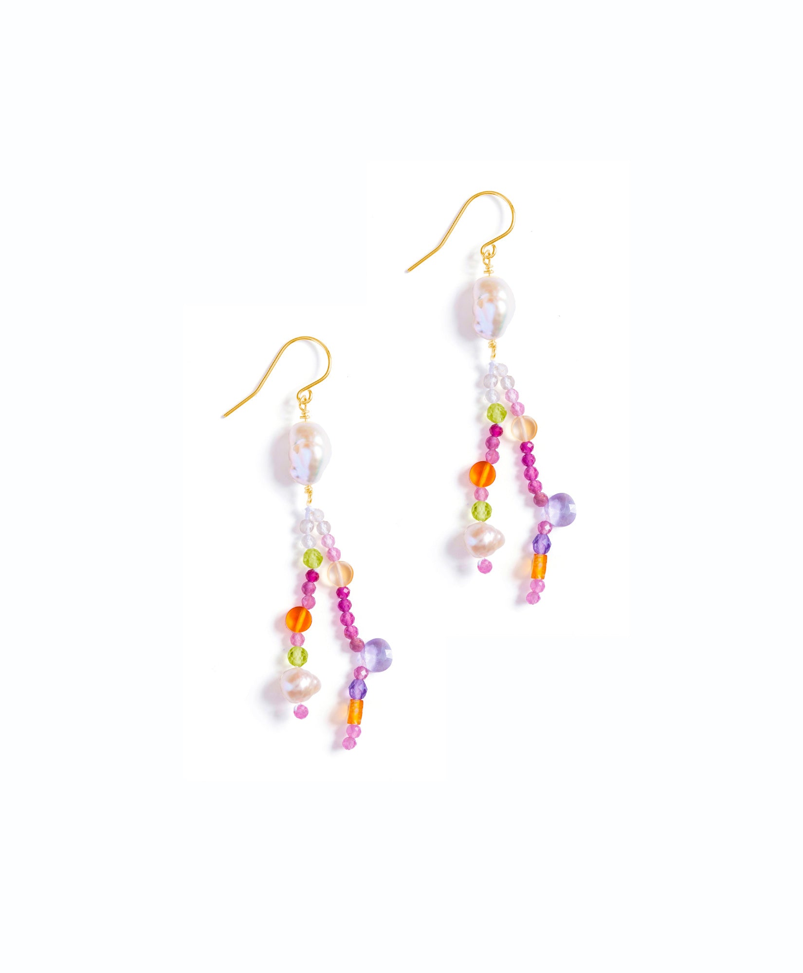 From deep wine red to lush lavenders, soft floral pinks and shades of citrus orange, these vibrantly colored earrings are made of brilliant gemstones--ruby, tourmaline, amethyst, peridot, carnelian and freshwater pearls.