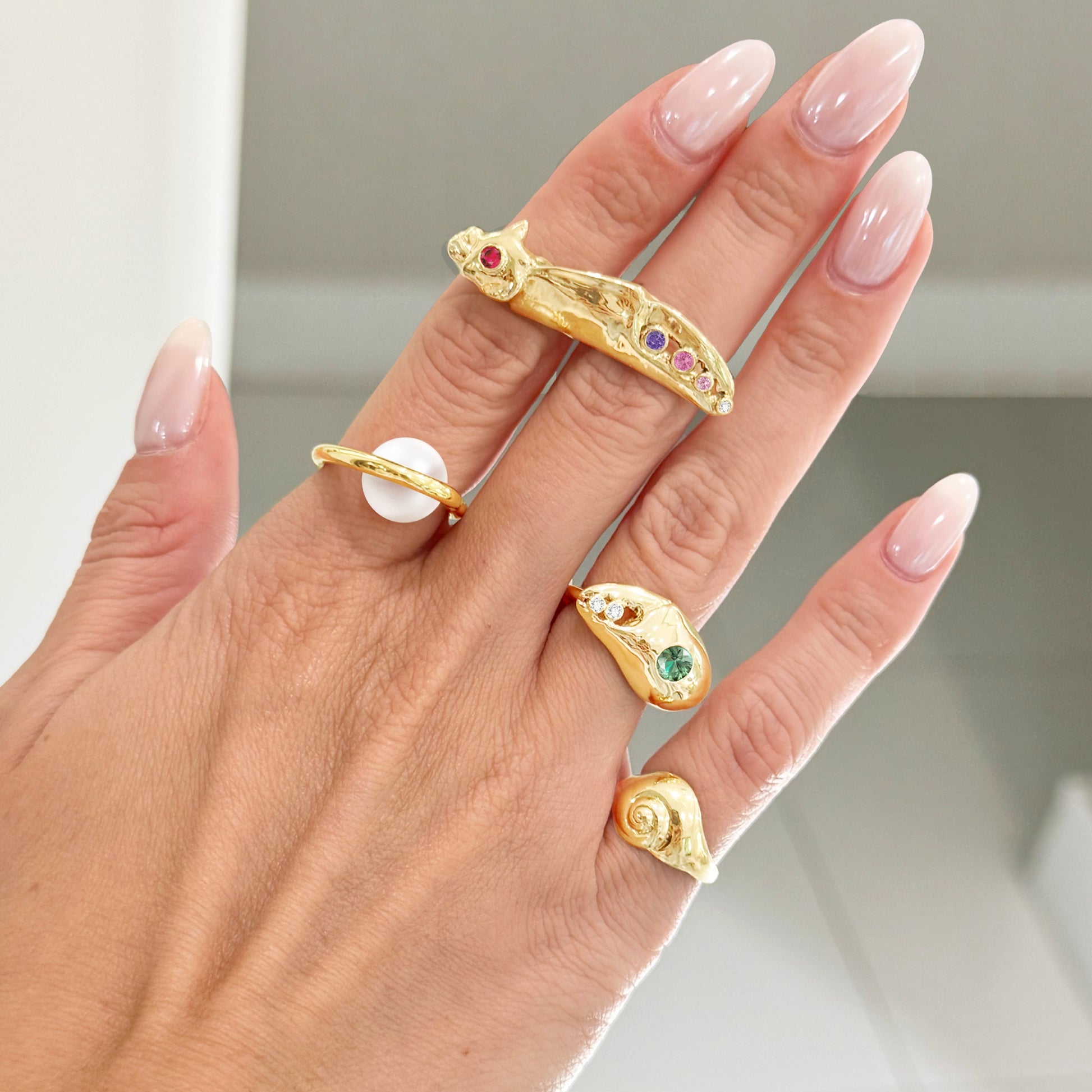 Solid 14k gold ring featuring garnet, pink tourmaline and natural diamond stones. Note, this is a two finger ring. Email us at rennstudio.ny@gmail.com after ordering to advise preferred ring size.