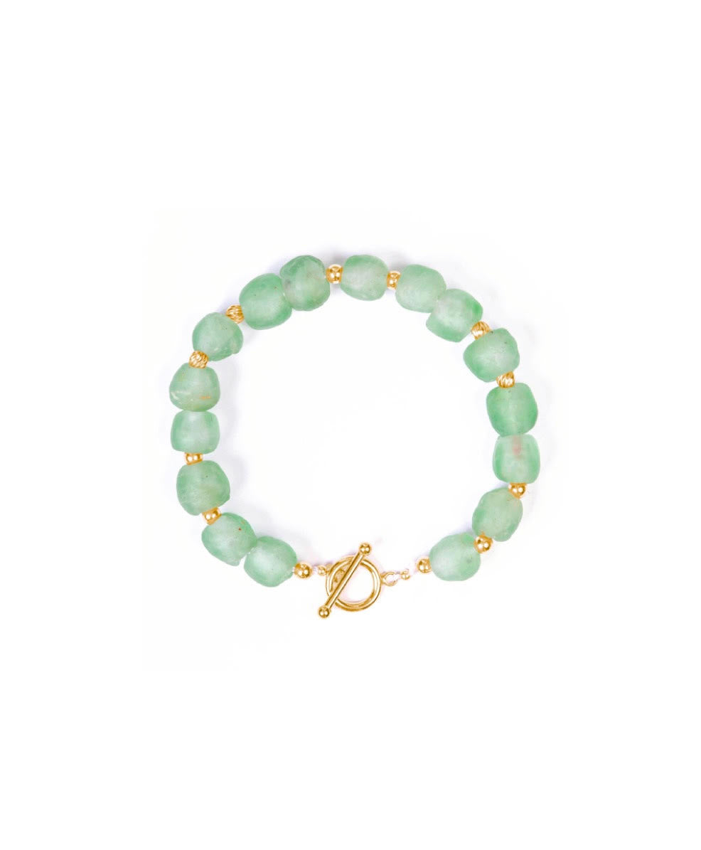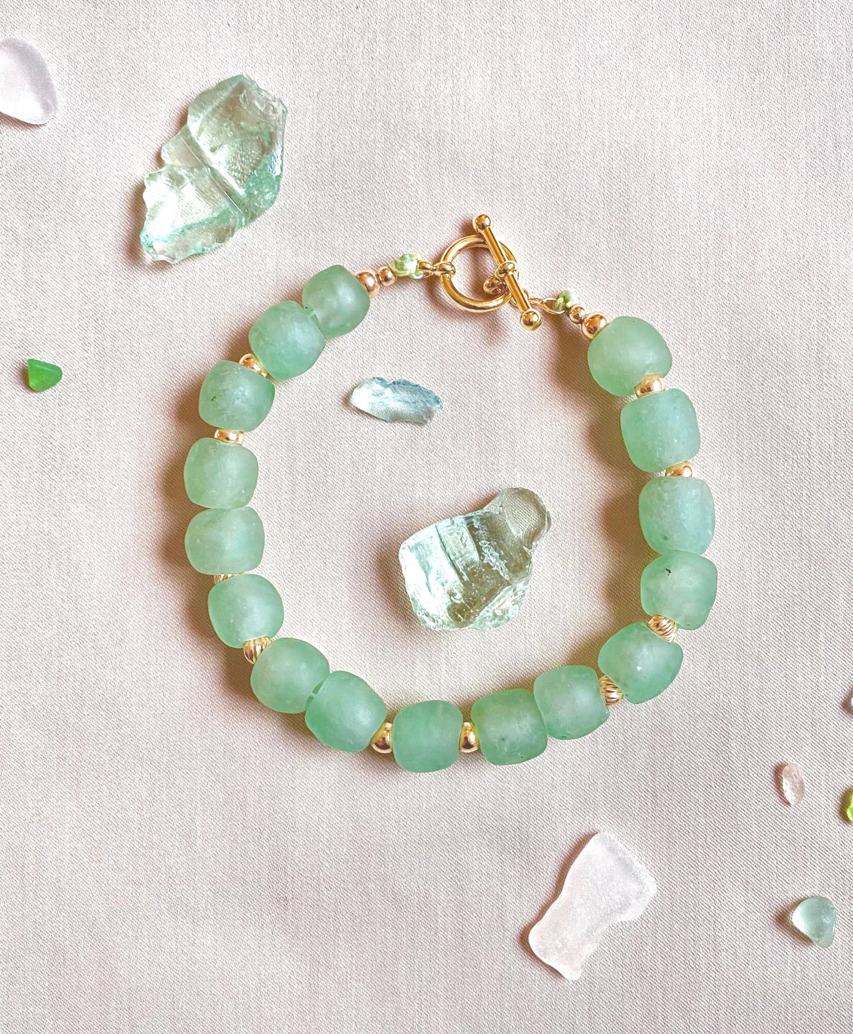 Seaglass Bracelet features rich, luminous aqua beads that were handmade by artisans in Ghana, Africa. Using a centuries old technique, recycled glass is heated and reshaped in clay molds.